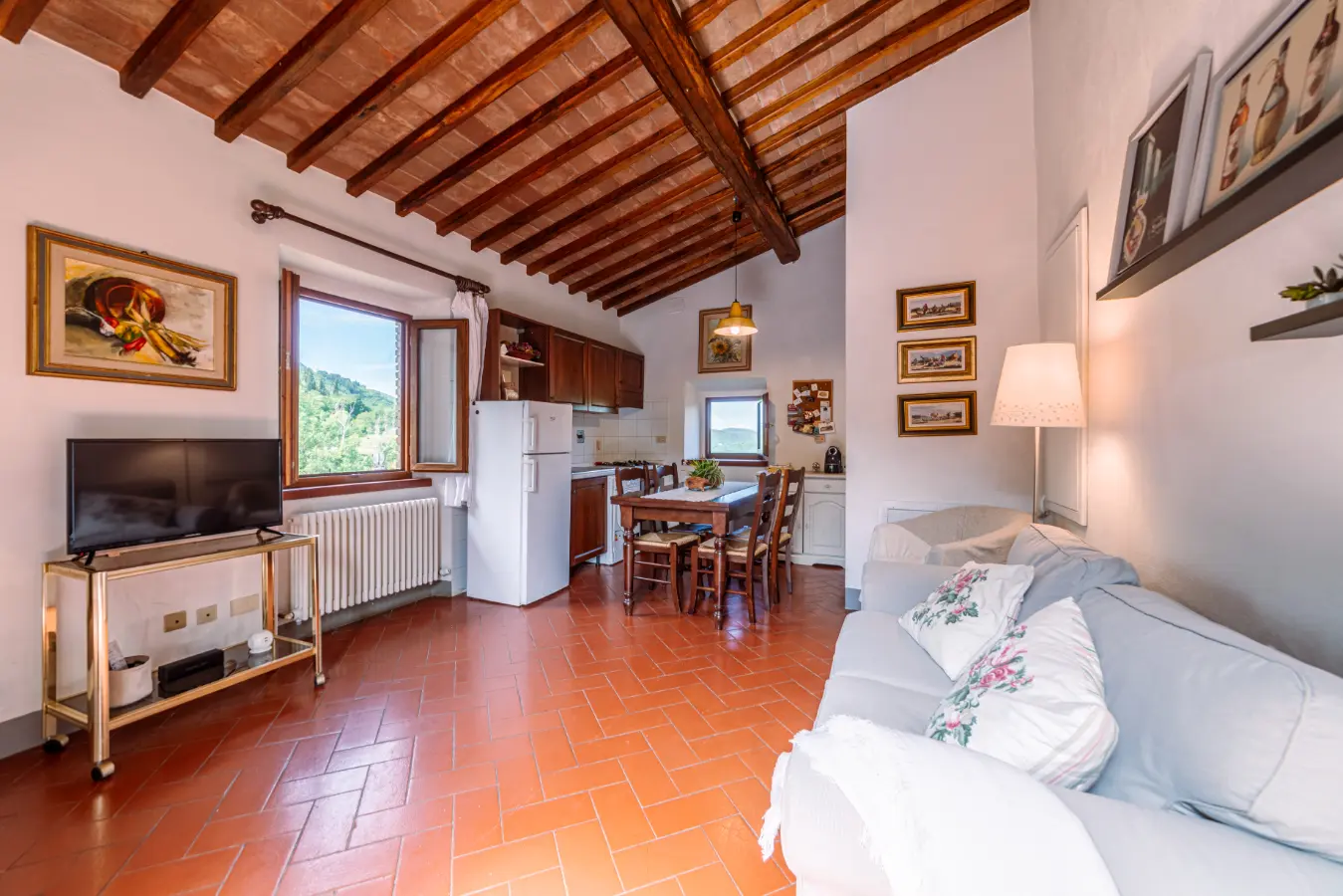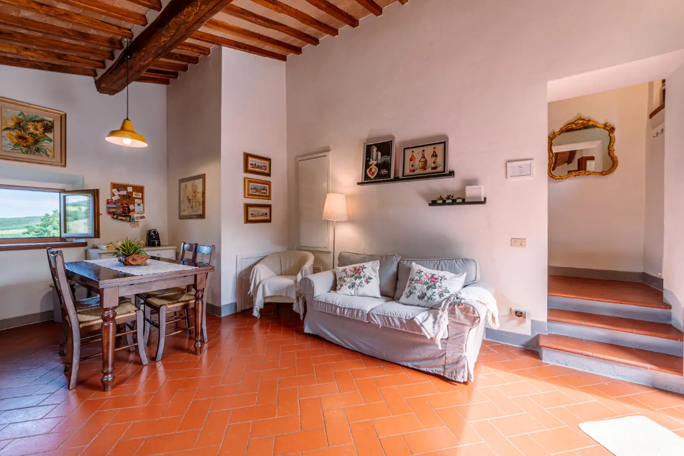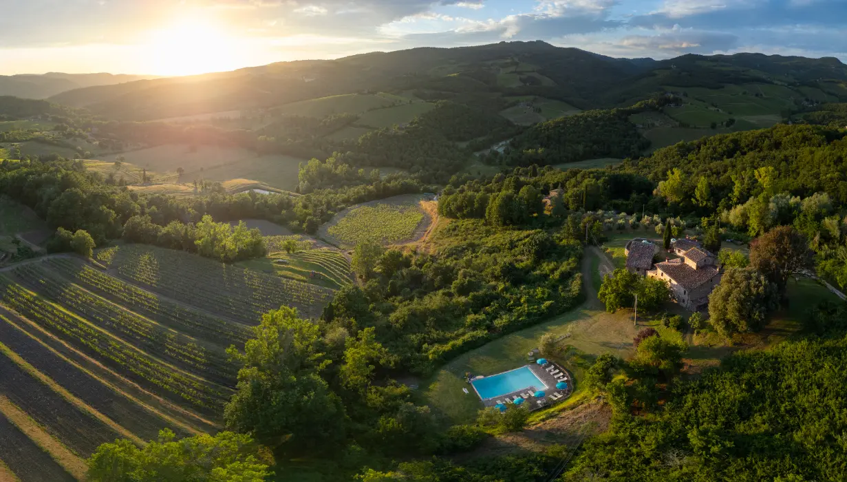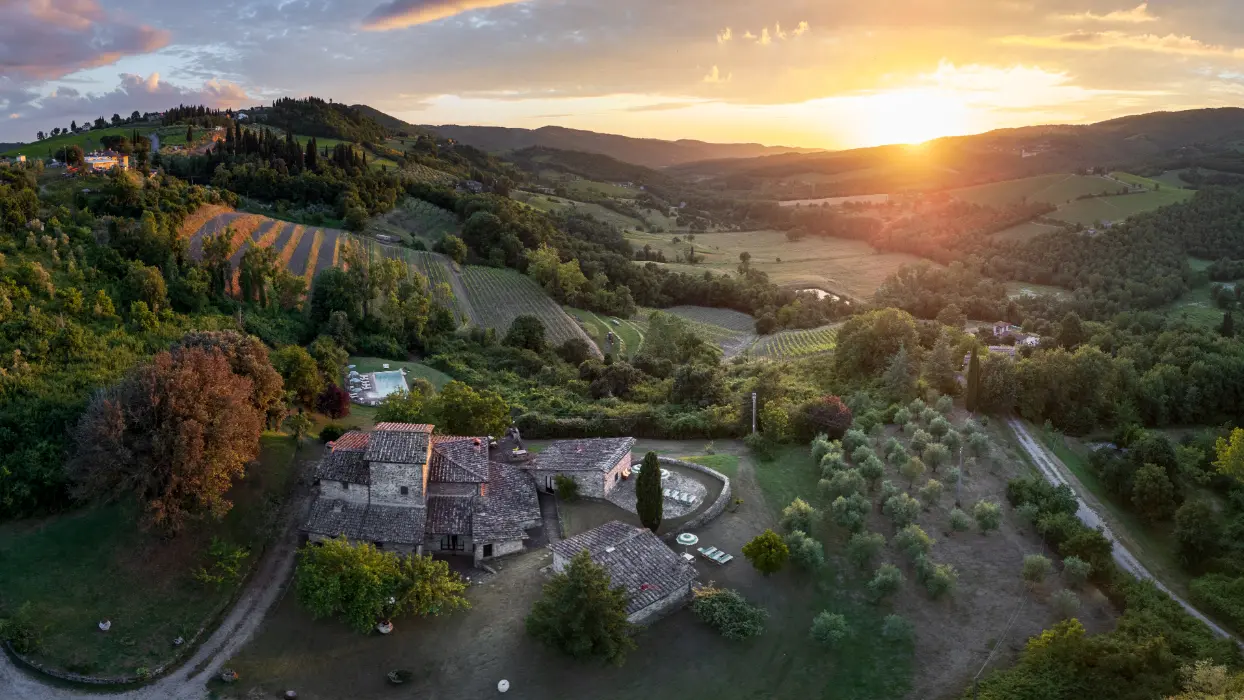 Immagina di trovarti nel bel mezzo del paesaggio del Chianti ma a solo 1km dal centro storico di Radda e di poterti affacciare su un panorama mozzafiato che saprà regalarti incantevoli tramonti.